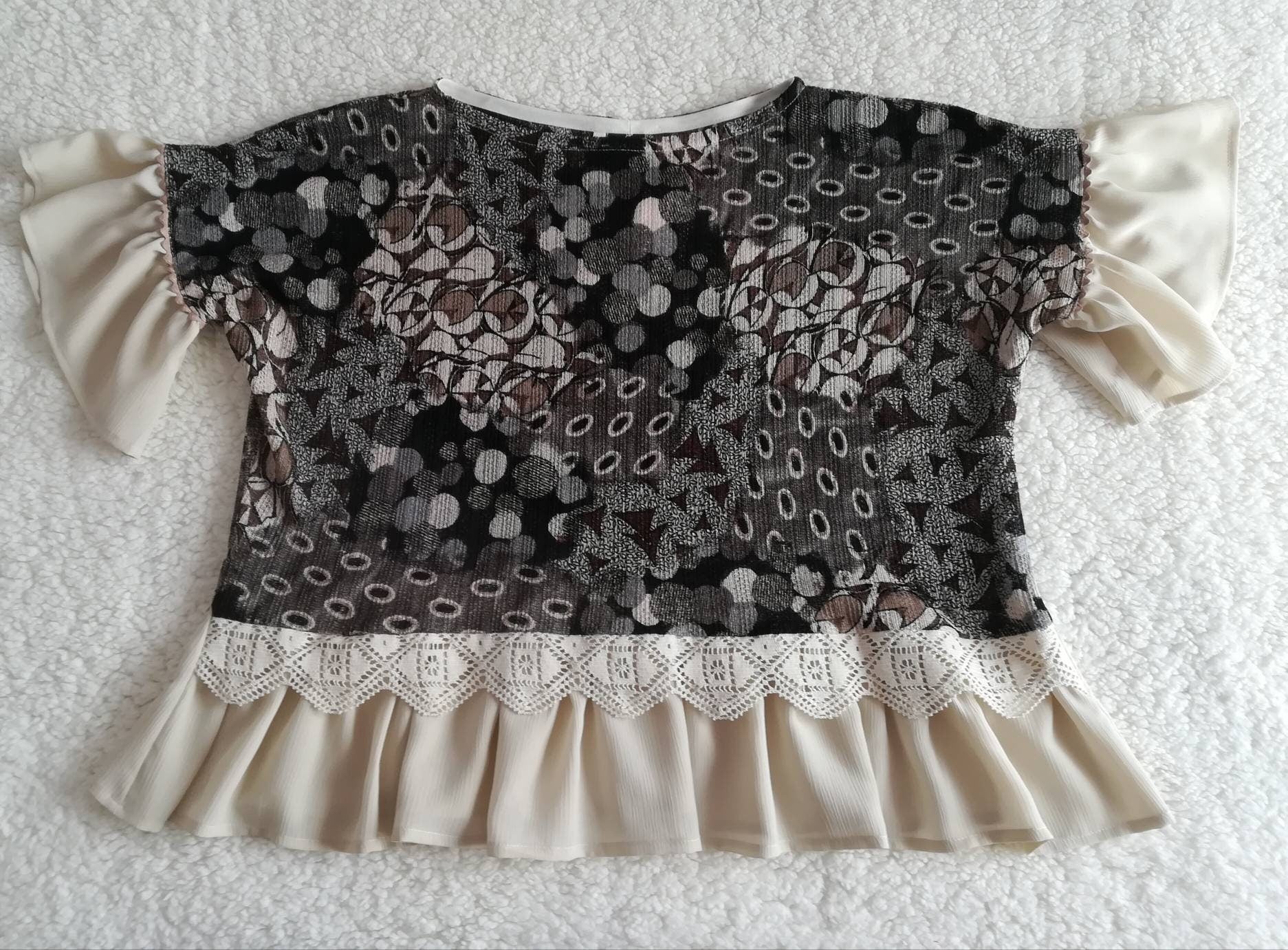 Túnica com base estampada e junção de folho bege na base e nas magas. Modelo largo.