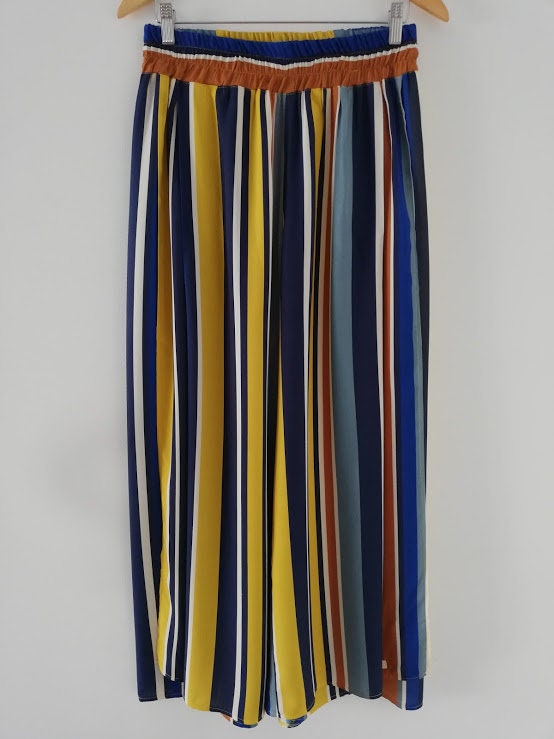 Estas calças largas às riscas da Made4you® foram pensadas para quem procura liberdade, cor e elegância num só look. O design fluido, com aberturas laterais discretas, proporciona movimento e frescura, enquanto o cós com elástico na cintura adapta-se com conforto a vários tipos de corpo.