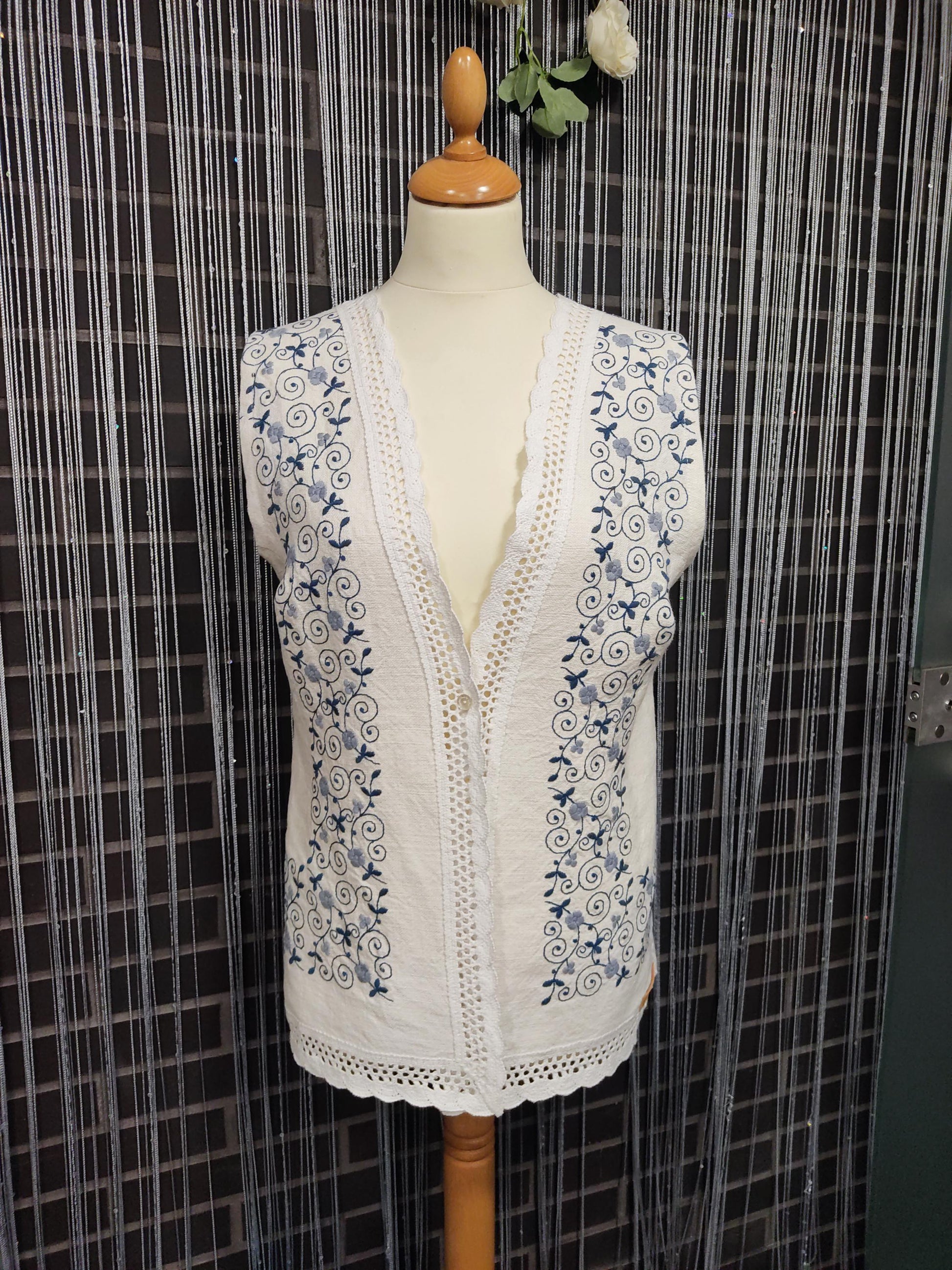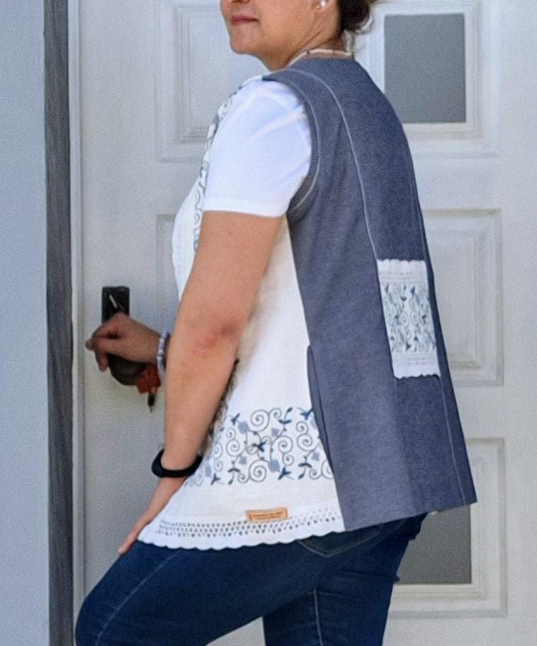 Colete Artesanal com Bordado Azul – Linho Reciclado e Costas em Ganga – Upcycled – M/L