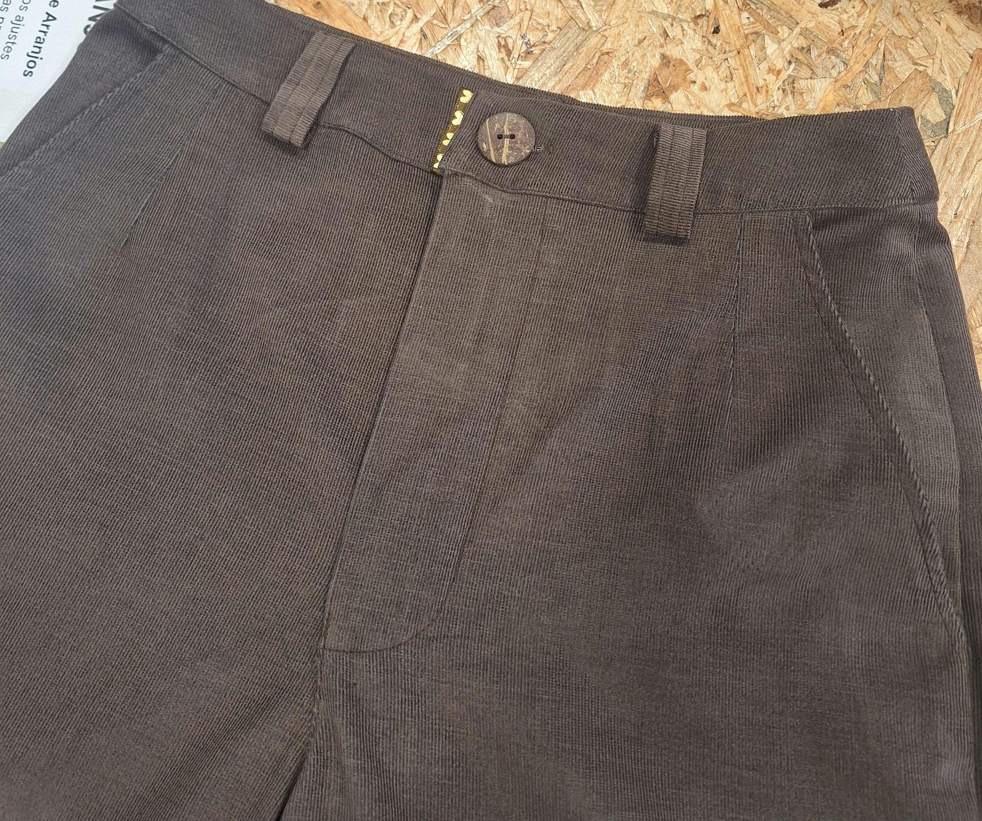 Em tom chocolate, a calça distingue-se pelo corte reto e pelo acabamento rendado na bainha — um detalhe que reforça o caráter exclusivo da peça. O tecido macio e estruturado em bombazine de rica fina, garante um caimento impecável e um conforto que acompanha o movimento.