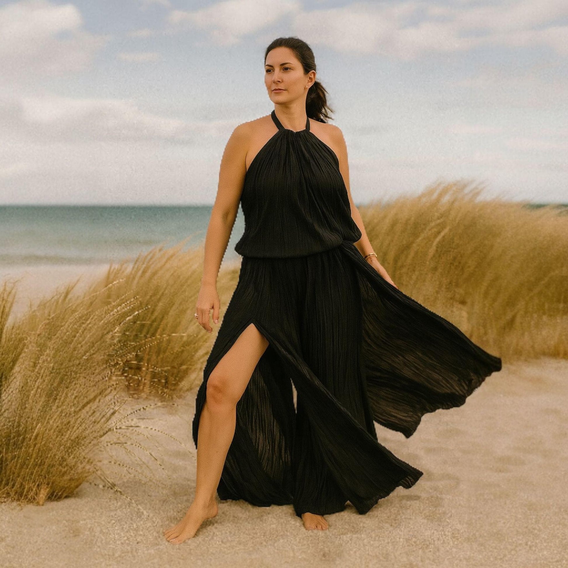 Este macacão plissado preto da Made4you® combina sofisticação e fluidez num design único e confortável. A peça é composta por um top estilo cai-cai com elástico, garantindo ajuste e sustentação, e uma sobreposição com alça que se prende ao pescoço, criando um efeito elegante e moderno.