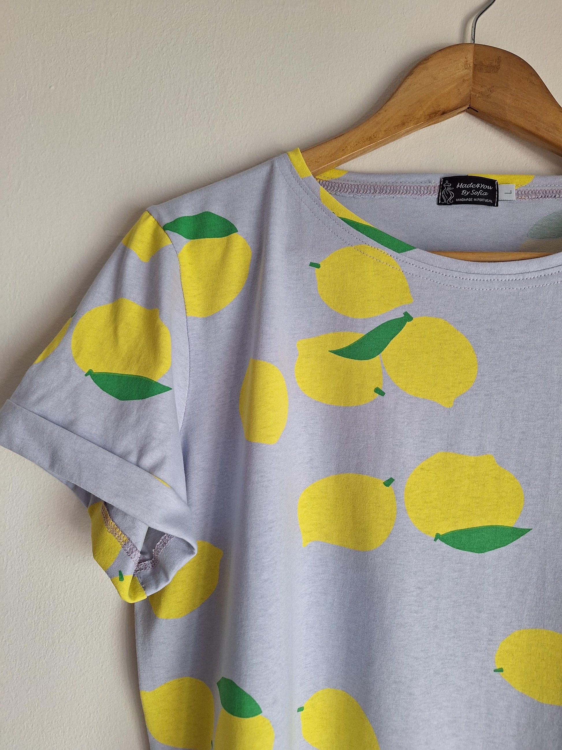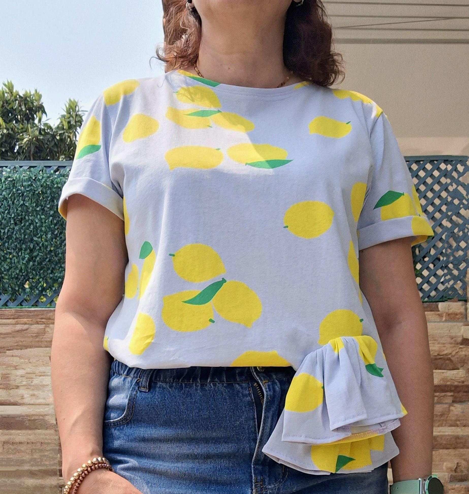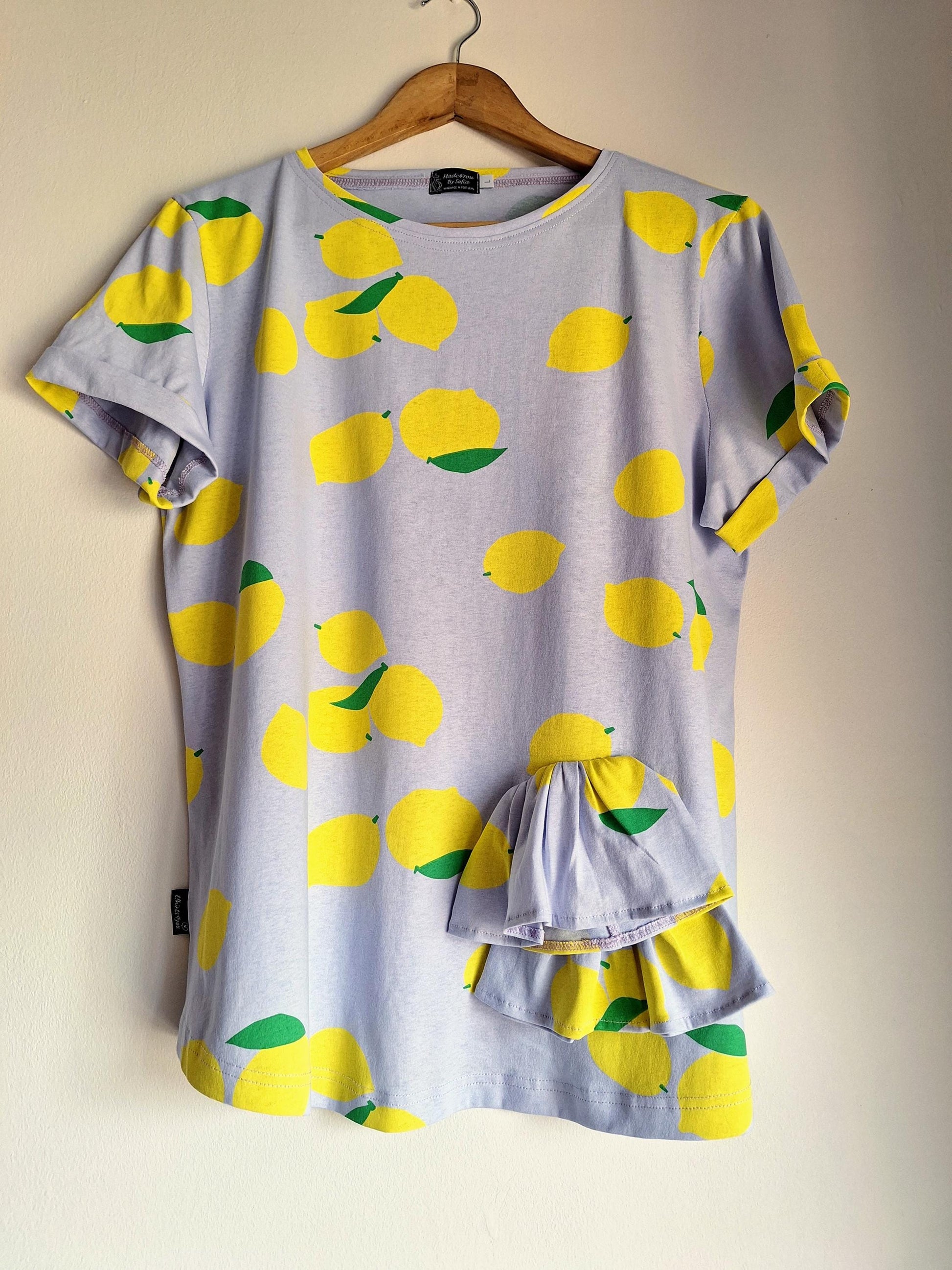 T-shirt feminina com estampa de limão | Blusa de verão feita à mão | Ruffle top exclusivo | Roupa artesanal Made in Portugal