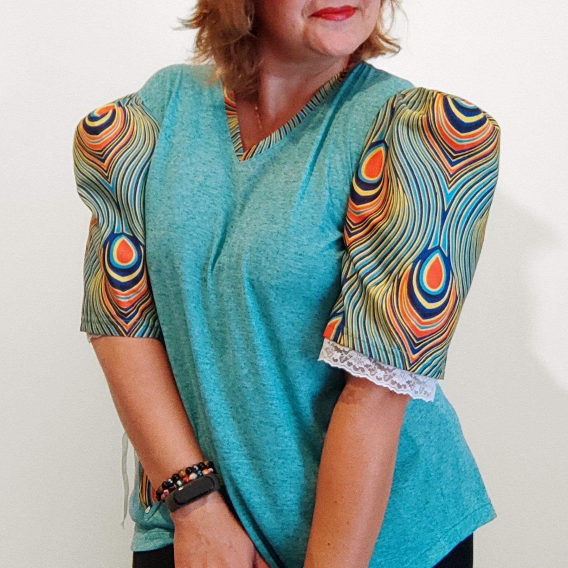 T-shirt para senhora em algodão azul com mangas em balão feitas em capulana com desenho de penas de pavão, disponível em vários tamanhos
