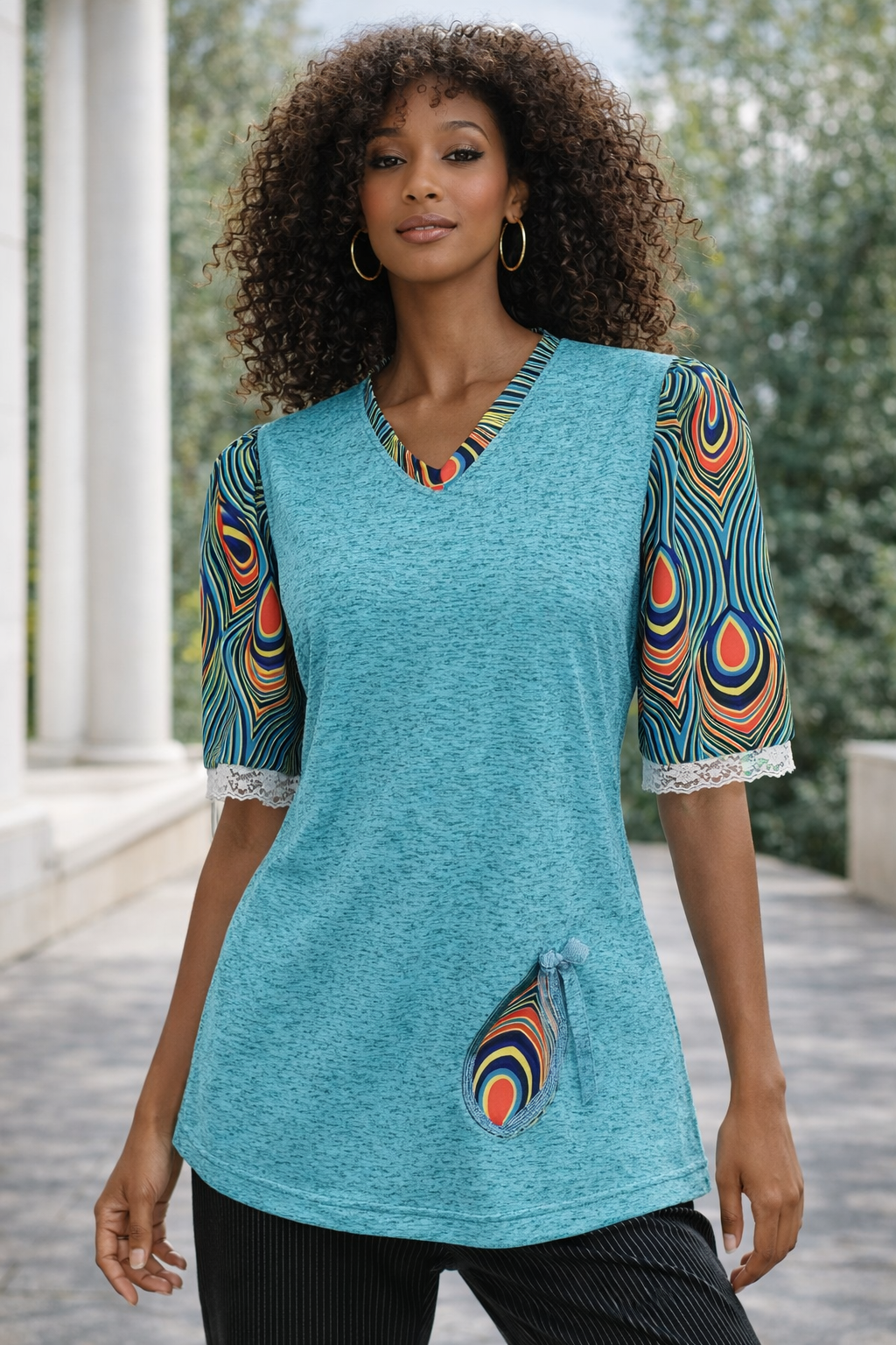 Esta t-shirt da Made4you® combina um corpo em tecido suave azul com mangas em capulana de padrão vibrante, criando um contraste moderno e muito elegante. O resultado é uma peça original, perfeita para mulheres que gostam de vestir algo diferente e cheio de personalidade.