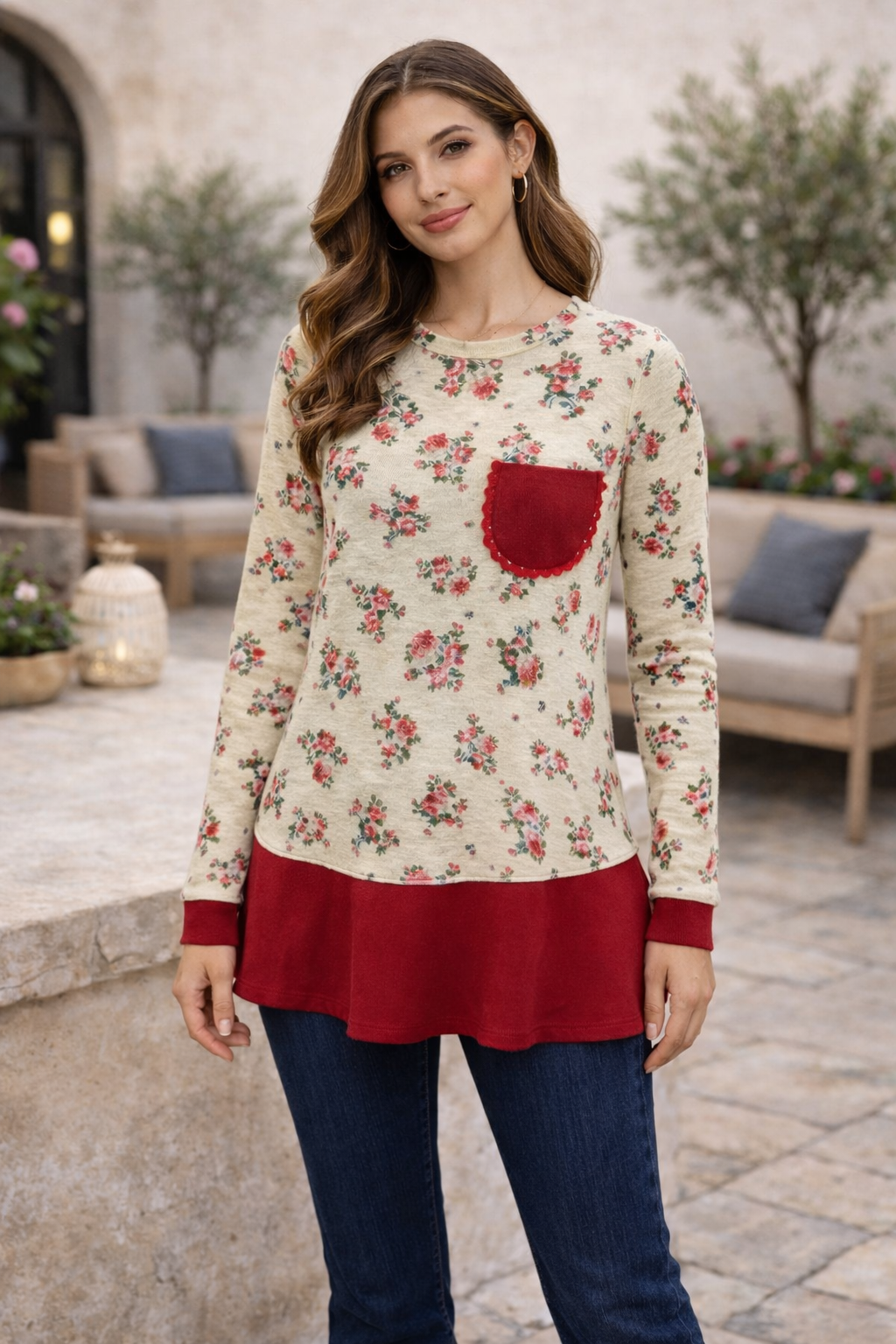 Manga comprida com punho, malha em bege floral com fio dourado, bolso em malha vermelha com renda e folho evasé em malha vermelha.