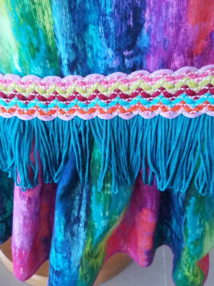 Com acabamento em ponto rolinho nos folhos e franjas de poliéster em tom turquesa com galão colorido no folho de baixo.
